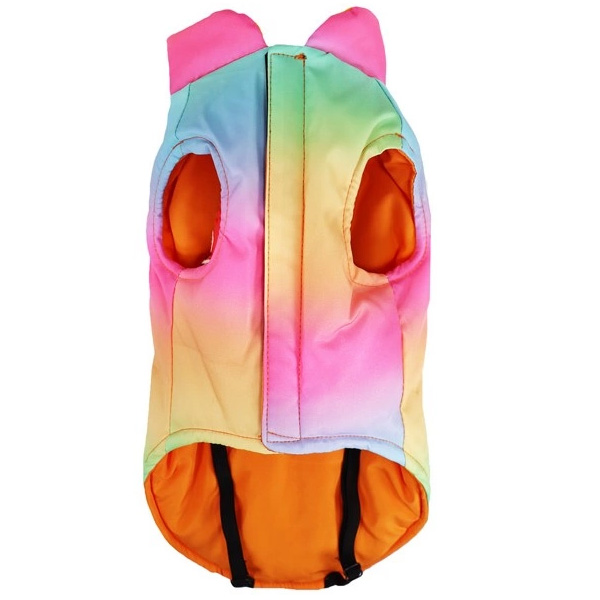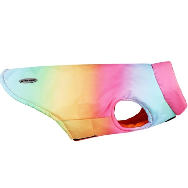 Cappottino impermeabile per cani Rainbow, con fantasia arcobaleno brillante e vivace.