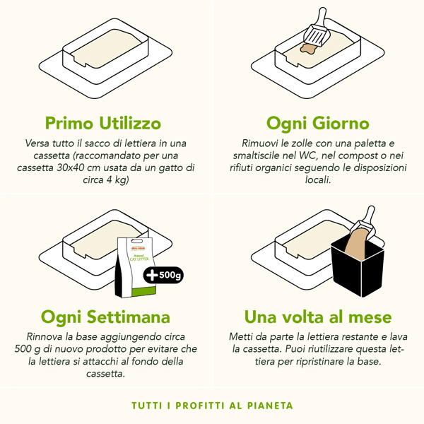 L’amido contenuto nelle fibre vegetali agglomera velocemente mentre gli enzimi neutralizzano i cattivi odori.