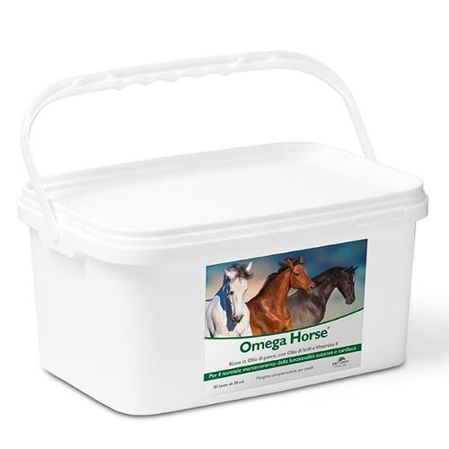 I principi nutrizionali di Omega Horse favoriscono il normale mantenimento della funzionalità cutanea e cardiaca del cavallo.