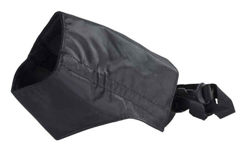 Museruola a fascia in nylon con attacco click-lock. Lavabile in lavatrice.