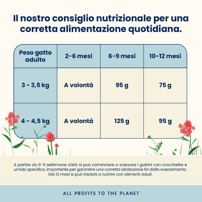 carni e derivati (pollo fresco14% ), cereali (riso 14% ), estratti di proteine vegetali, oli e grassi, sostanze minerali, sottoprodotti di origine vegetale (inulina di cicoria - fonte di FOS- 0,1% ), mannano-oligo-saccaridi. Additivi-additivi nutrizionali: vitamina A 26000 IU/kg, vitamina D3 1400 IU/kg, vitamina E 400 mg/kg, vitamina B1 12 mg/kg, vitamina B2 14 mg/kg, calcio Dpantotenato 20 mg/kg, vitamina B6 12 mg/kg, vitamina B12 0,15 mg/kg, biotina 0,50 mg/kg, niacina 25 mg/kg, acido folico 1 mg/kg, taurina 1000 mg/kg, DL- metionina 500 mg/kg, solfato di rame pentaidrato 32 mg/kg , chelato rameico di amminoacidi idrato 33 mg/kg, iodato di calcio anidro 1,64 mg/kg, solfato di zinco monoidrato 222 mg/kg , chelato di zinco di aminoacidi idrato 267 mg/kg, solfatomanganoso monoidrato 20 mg/kg, selenio in forma organica 80 mg/kg