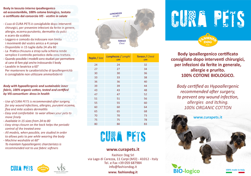 L’idea di CURA PETS nasce da una richiesta diretta dei clienti Fashion Dog (pets care, veterinari) e prende forma dal rapporto con il Consorzio Vis di Carpi (Vestire in Salute) che dal 2003 produce un tessuto biologico ed ipoallergenico, testato con le Università di Modena e Ferrara, interamente realizzato in Italia