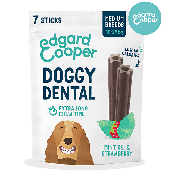 Doggy Dental è l'innovativo stick dentale realizzato solo con ingredienti vegetali, ipocalorico e quindi perfetto per l'uso quotidiano: uno stick al giorno è ideale per abituare il cane a una sana routine di igiene orale e assicurargli una bocca in salute. Per combattere anche la placca più ostinata Doggy Dental è essiccato ad aria per una durata più lunga, garantendo così una pulizia più profonda. Contiene menta per tenere a bada i cattivi odori e assicurare un alito fresco, calcio per denti forti e brillanti, fragola e un mix di deliziosi ingredienti vegetali per renderlo gustoso oltre che efficace. La confezione è realizzata con materiali biodegradabili al 100% .