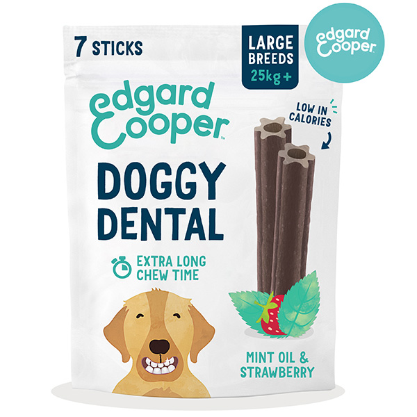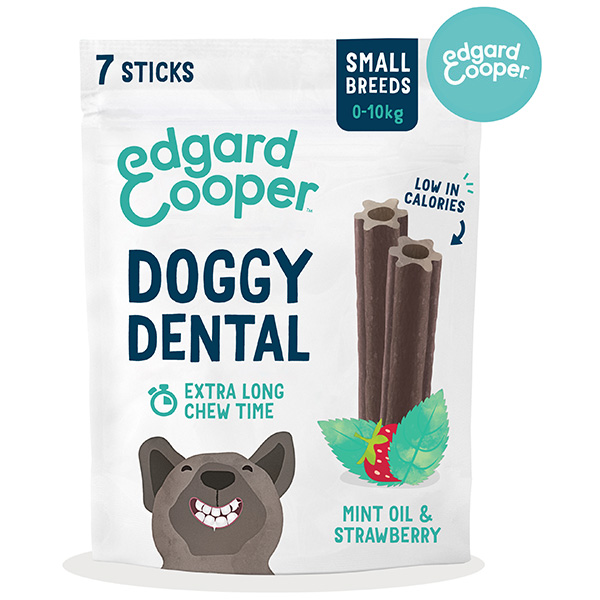 Doggy Dental è l'innovativo stick dentale realizzato solo con ingredienti vegetali, ipocalorico e quindi perfetto per l'uso quotidiano: uno stick al giorno è ideale per abituare il cane a una sana routine di igiene orale e assicurargli una bocca in salute. Per combattere anche la placca più ostinata Doggy Dental è essiccato ad aria per una durata più lunga, garantendo così una pulizia più profonda. Contiene menta per tenere a bada i cattivi odori e assicurare un alito fresco, calcio per denti forti e brillanti, fragola e un mix di deliziosi ingredienti vegetali per renderlo gustoso oltre che efficace. La confezione è realizzata con materiali biodegradabili al 100% .