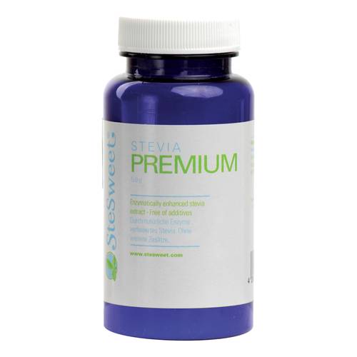 SteSweet STEVIA PREMIUM Polvere che combina la dolcezza del Reb A, il più dolce estratto dalla pianta stevia, con l'alcool eritritolo uno zucchero naturale. Eritritolo possiede un gusto molto simile allo zucchero, che esalta la dolcezza della stevia. Questo prodotto è stabile al calore e può essere utilizzato come dolcificante da tavola.
