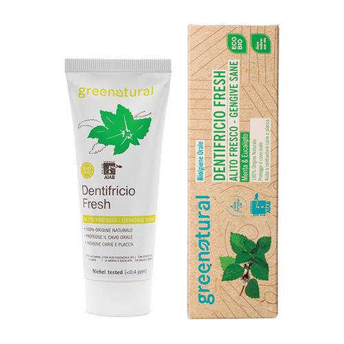 Dentifricio 100% origine naturale, protegge il cavo orale e aiuta a contrastare carie e placca. Senza saccarina e fluoro. Con olio essenziale bio di menta ed eucalipto. Con estratti bio di salvia e zenzero.