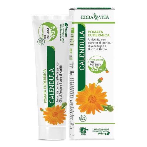 La pomata eudermica alla Calendula di Erba Vita è formulata con elevata concentrazione di estratti vegetali naturalmente attivi grazie all’innovativo multi-estratto FULL-POTENCY creato con la GLYCERIC-OIL-DRY formula, che utilizza contemporaneamente la triplice soluzione estrattiva della medesima pianta offincale: estratti gliceridi, oleosi e secchi, per ottimizzare l’azione finale sull’epidermide.