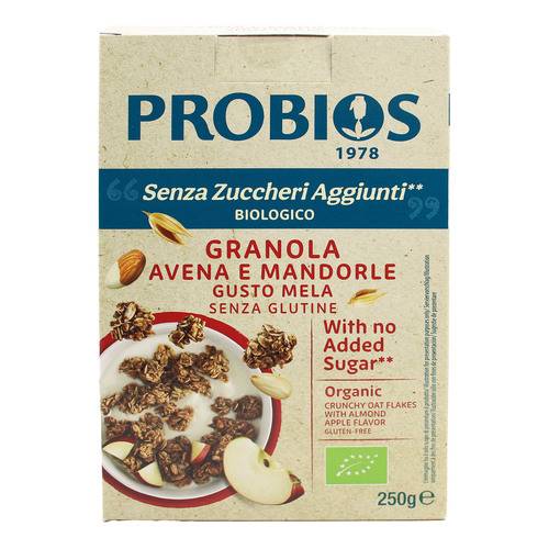 La granola avena e mandorle gusto mela senza zuccheri aggiunti è un nuovo prodotto per la colazione dolcificato con eritritolo che contiene solo gli zuccheri naturalmente presenti. Prodotto vegan.
